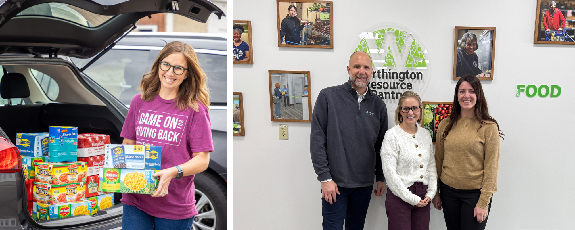 Donations are gathered for SVdP’s delivery (left); GM’s Doug Rentz (left) and Britny Jackson (right) with director of development, Madison Maves at Worthington Resource Pantry