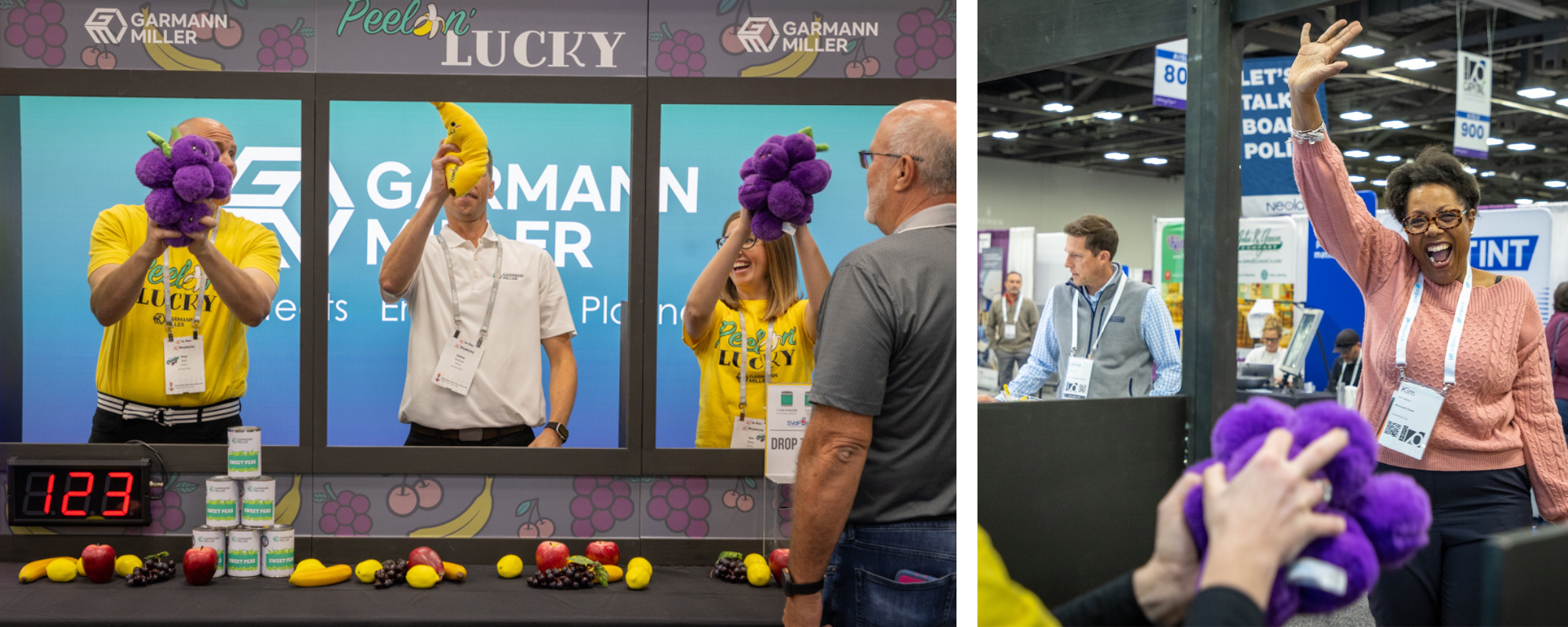 Conference attendees took on Peelin’ Lucky, GM’s human slot-machine game, where every play earned a canned food donation, and matching three of a kind doubled the contribution.