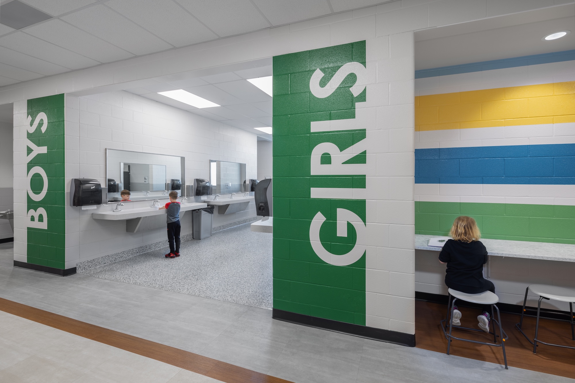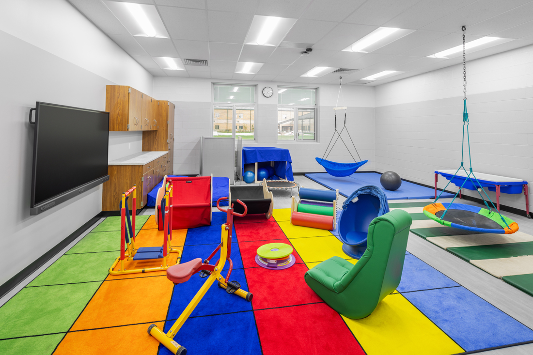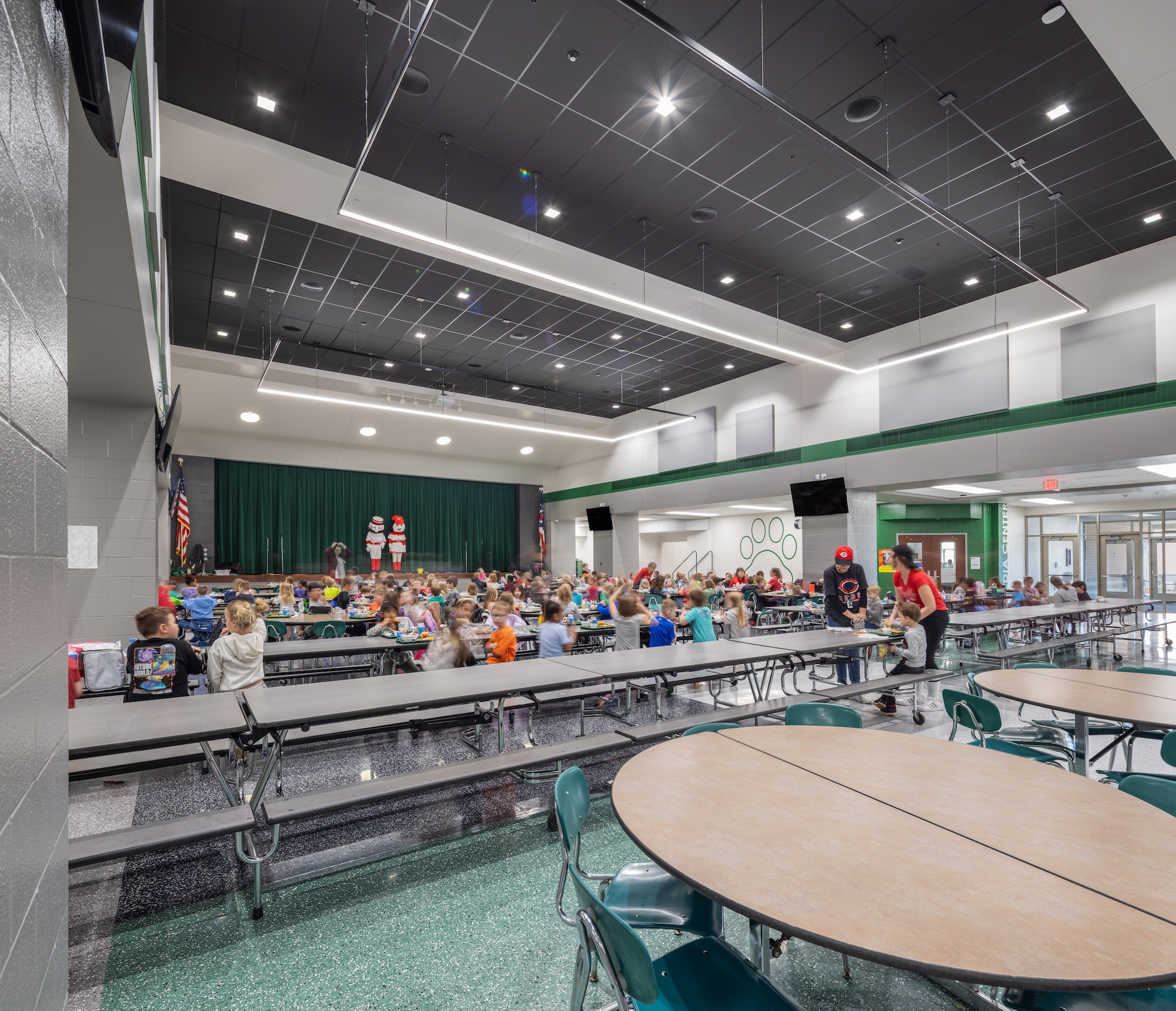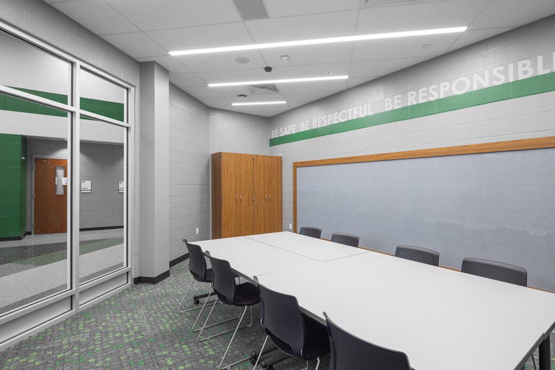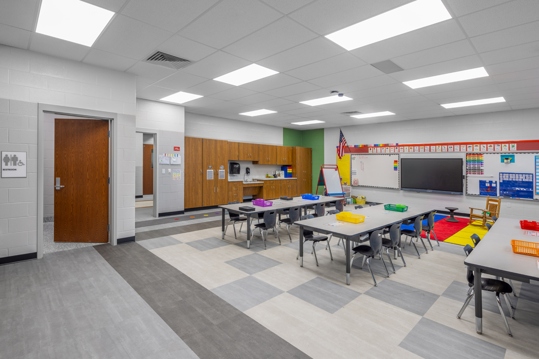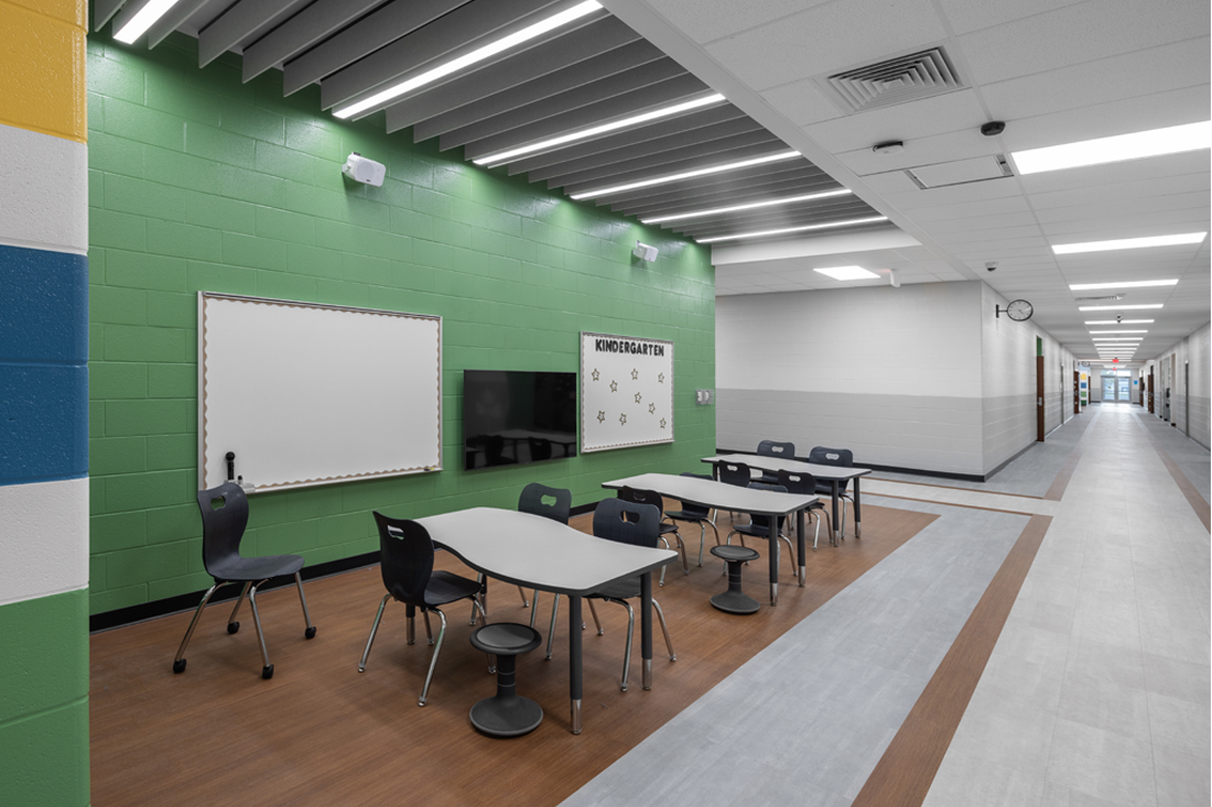The kitchen was expanded into the previous administrative area to accommodate the addition of grades PK-4, while the existing gymnasium was updated. A second auxiliary gym was designed to also serve as a storm shelter for all students and staff.