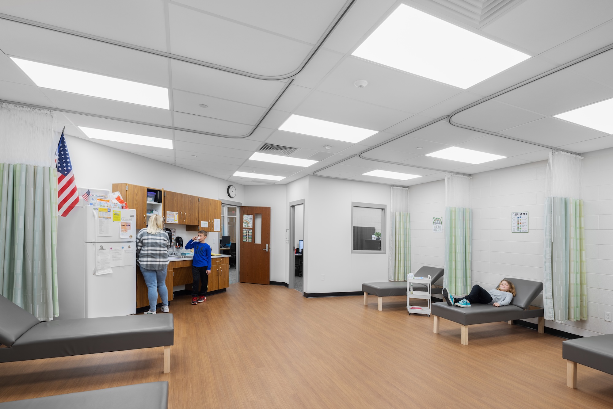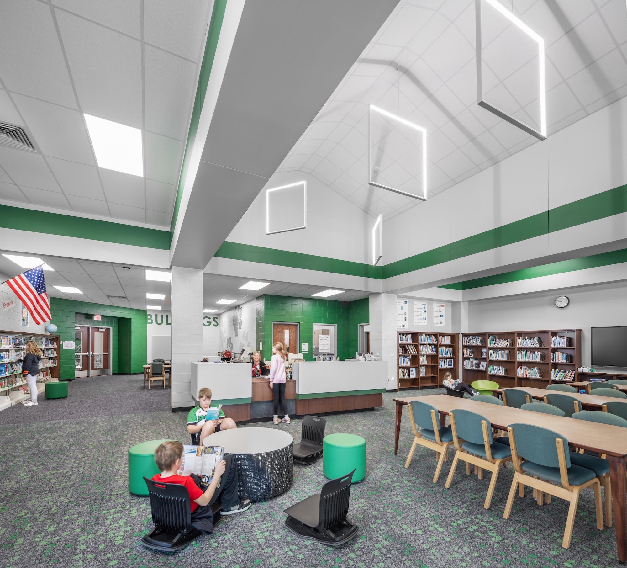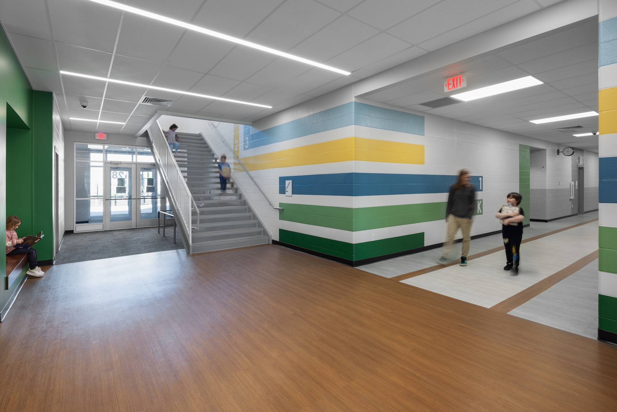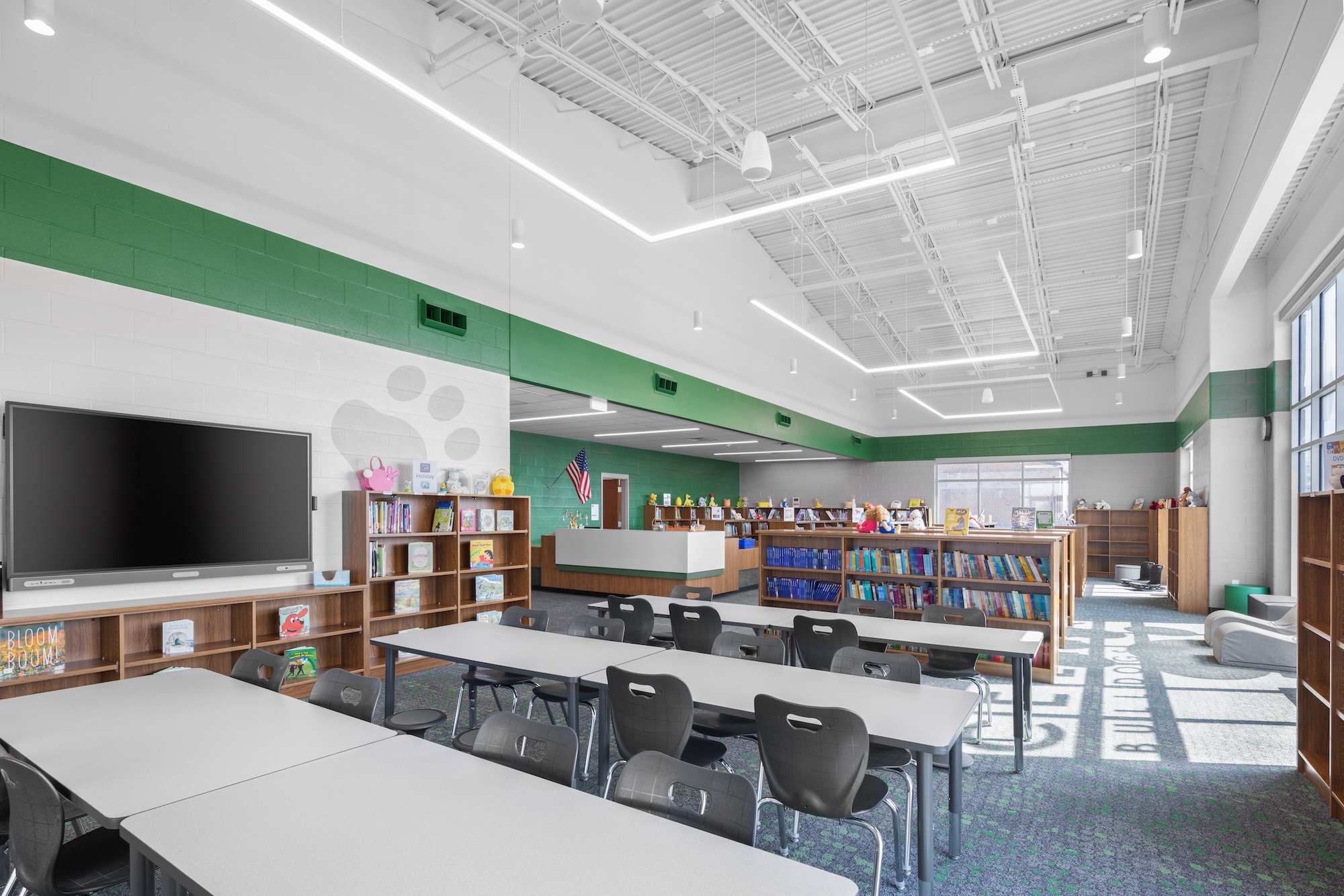 The kitchen was expanded into the previous administrative area to accommodate the addition of grades PK-4, while the existing gymnasium was updated. A second auxiliary gym was designed to also serve as a storm shelter for all students and staff.