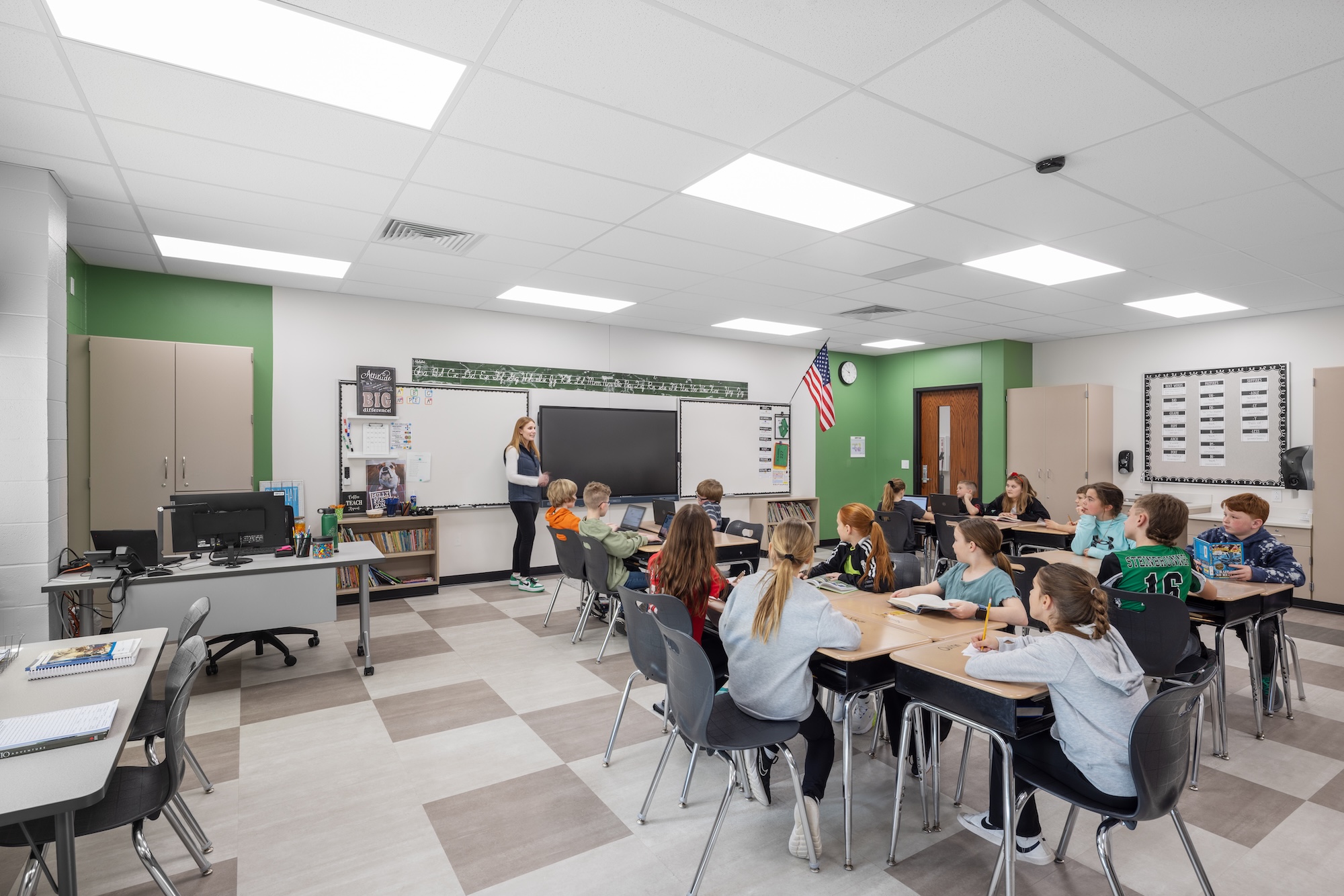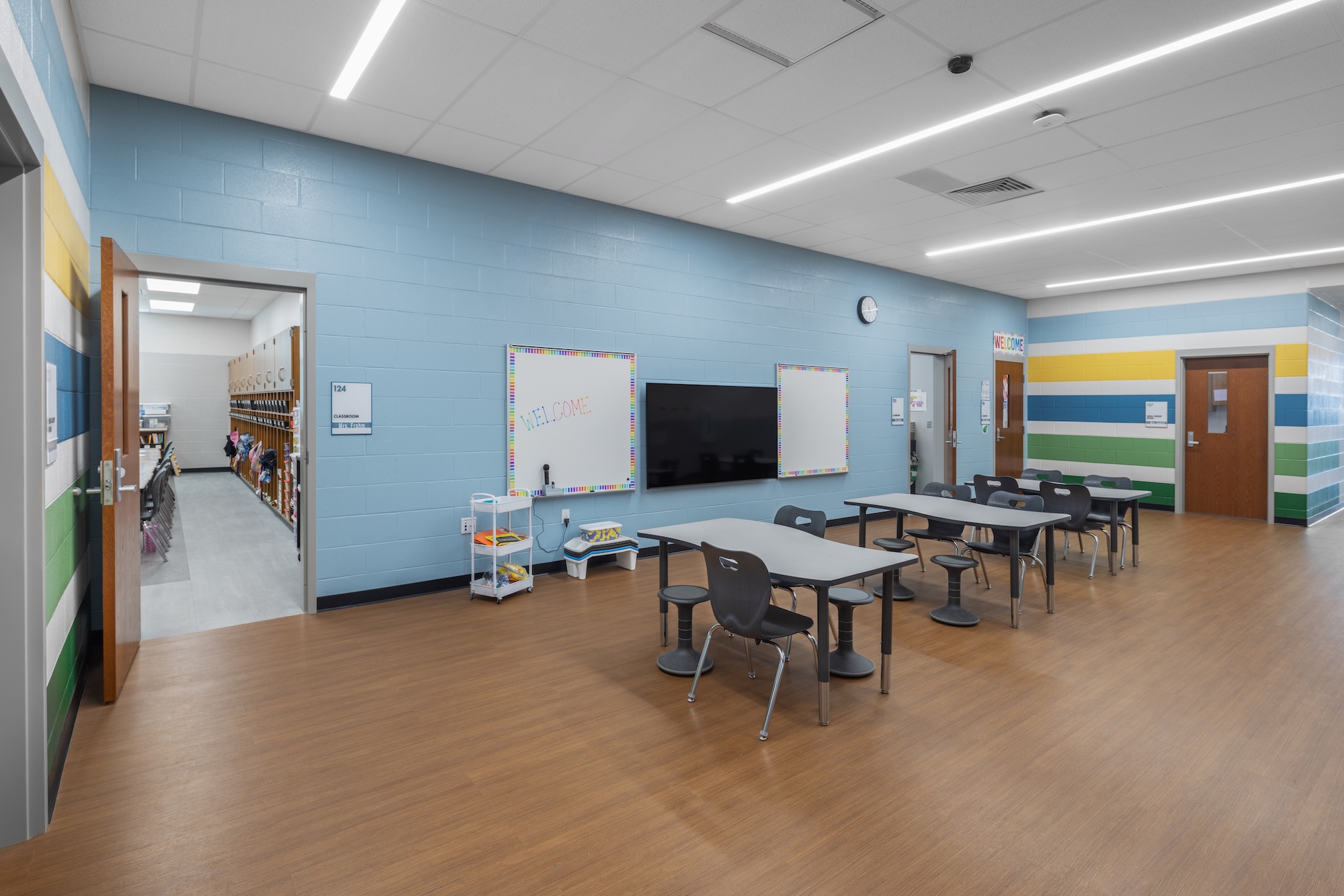 Extended learning areas complement classrooms that allow flexibility for breaking into smaller groups within the respective grade-level areas. Similarly, the loose furnishings in all classrooms allow multiple configurations for collaborative, student-led learning or traditional instruction.