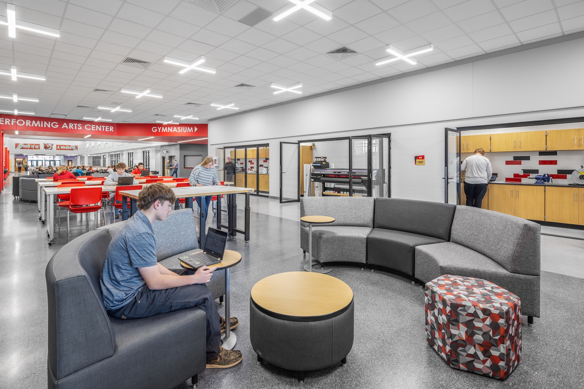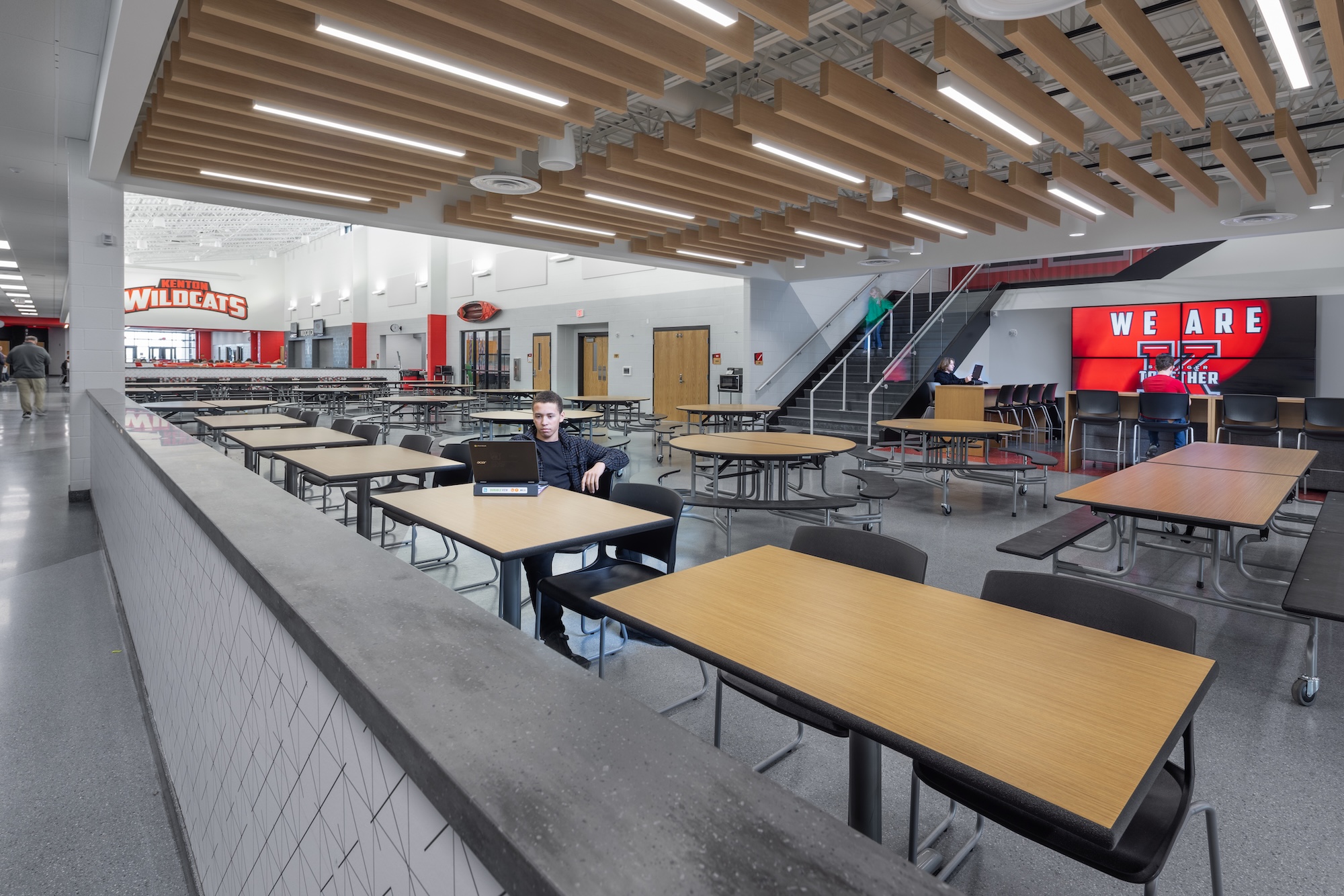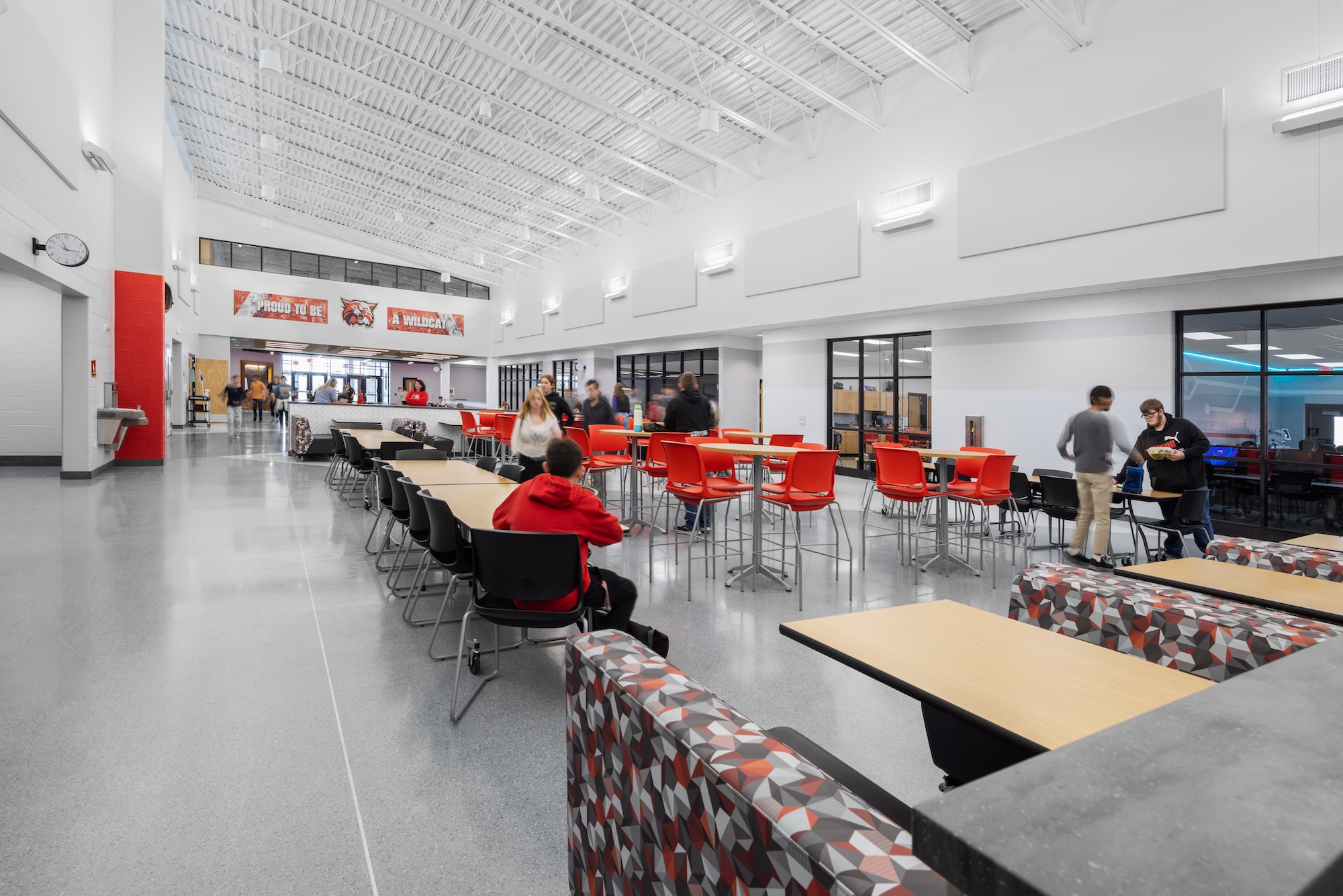 The new school also includes a 762-seat Performing Arts Center with a 3,000-square-foot stage featuring a partial fly system, along with a recording studio, video production room, and a 1,528-seat gymnasium. Additionally, the Wildcat Health Center, operated by Health Partners of Western Ohio, provides medical, behavioral health, social services, and substance use treatment within the school clinic.