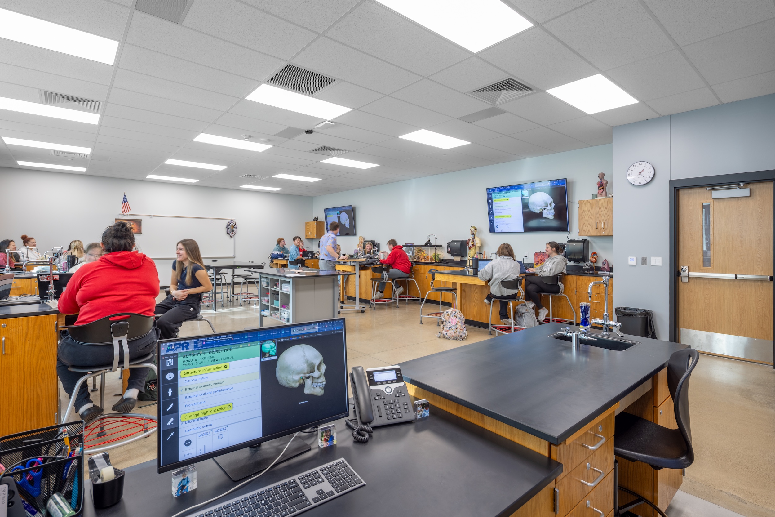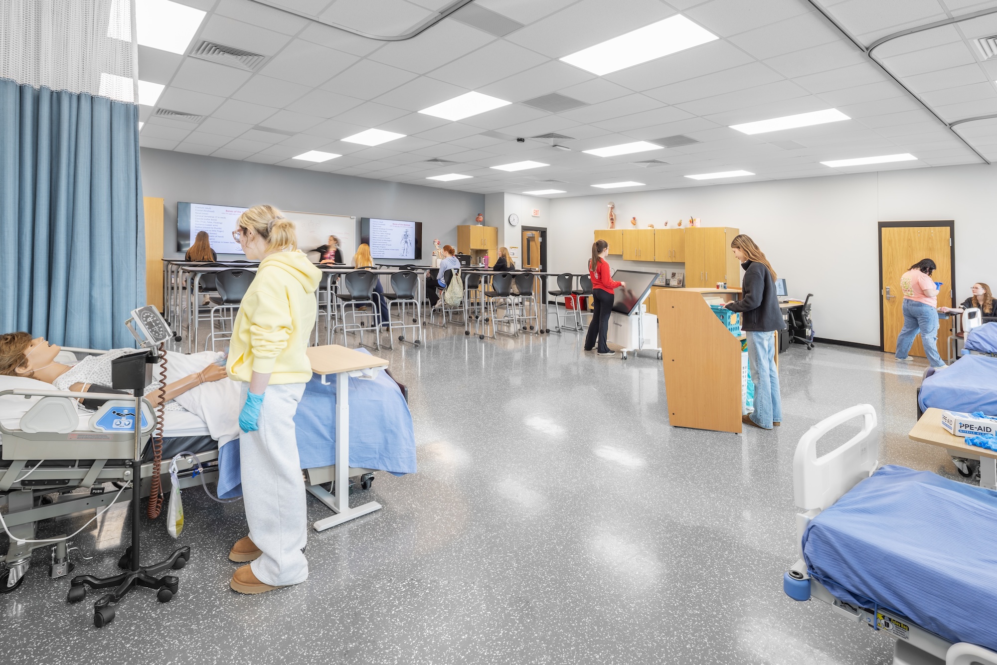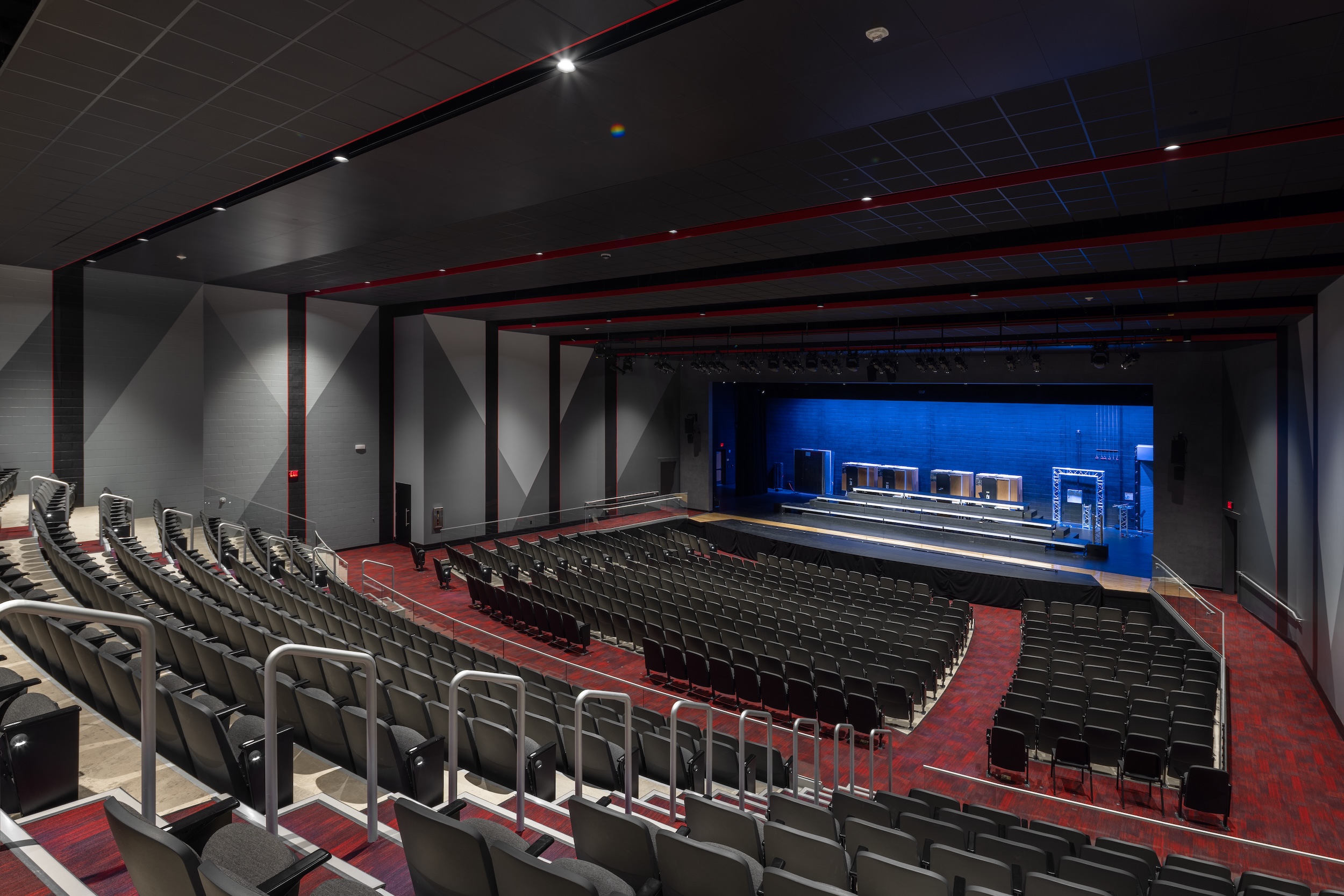 The new school also includes a 762-seat Performing Arts Center with a 3,000-square-foot stage featuring a partial fly system, along with a recording studio, video production room, and a 1,528-seat gymnasium. Additionally, the Wildcat Health Center, operated by Health Partners of Western Ohio, provides medical, behavioral health, social services, and substance use treatment within the school clinic.
