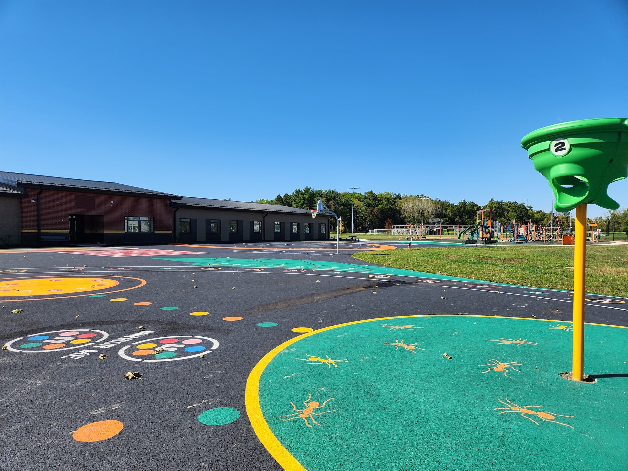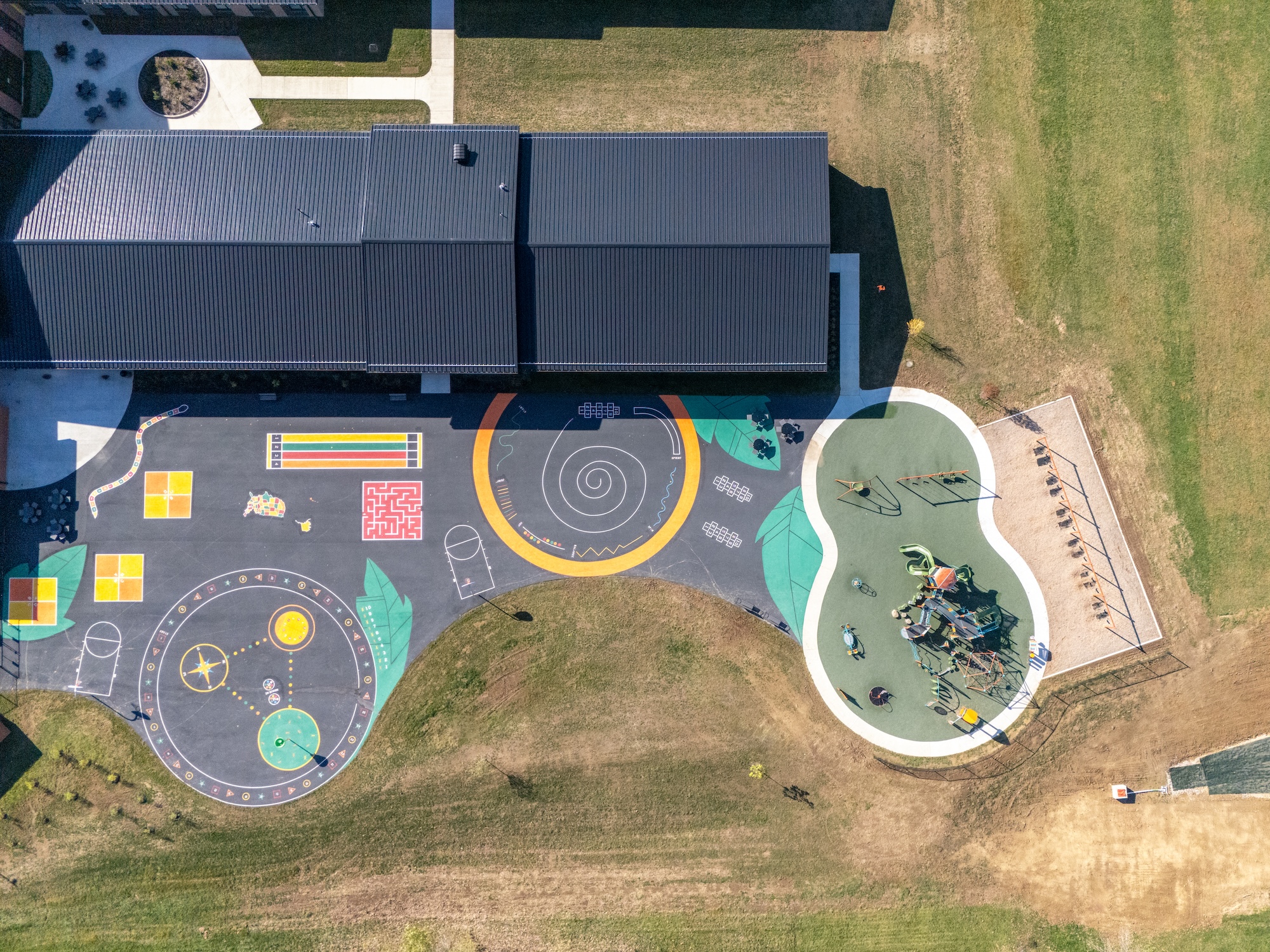The design prioritizes safety and flow. Separate entrances for bus and car traffic streamline drop-off and pick-up while reducing congestion. A secure vestibule at the main entrance provides controlled access to the administrative offices, ensuring safe entry for students, staff, and visitors. Just beyond the vestibule, a vibrant tile welcome wall greets guests, showcasing the school’s interior color palette and setting a cheerful tone upon arrival.