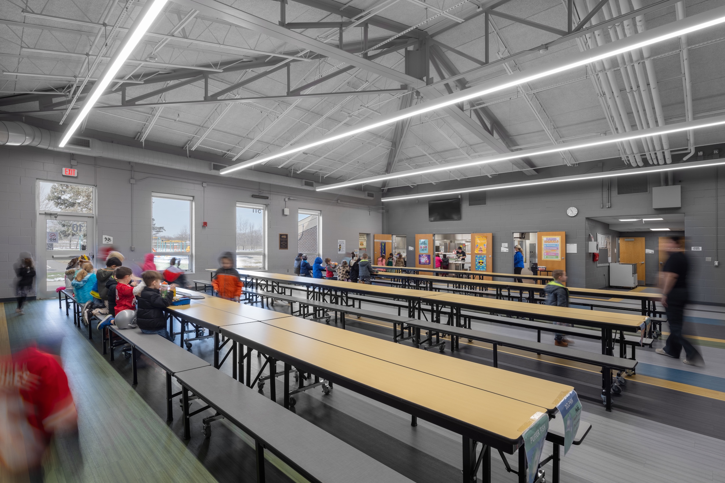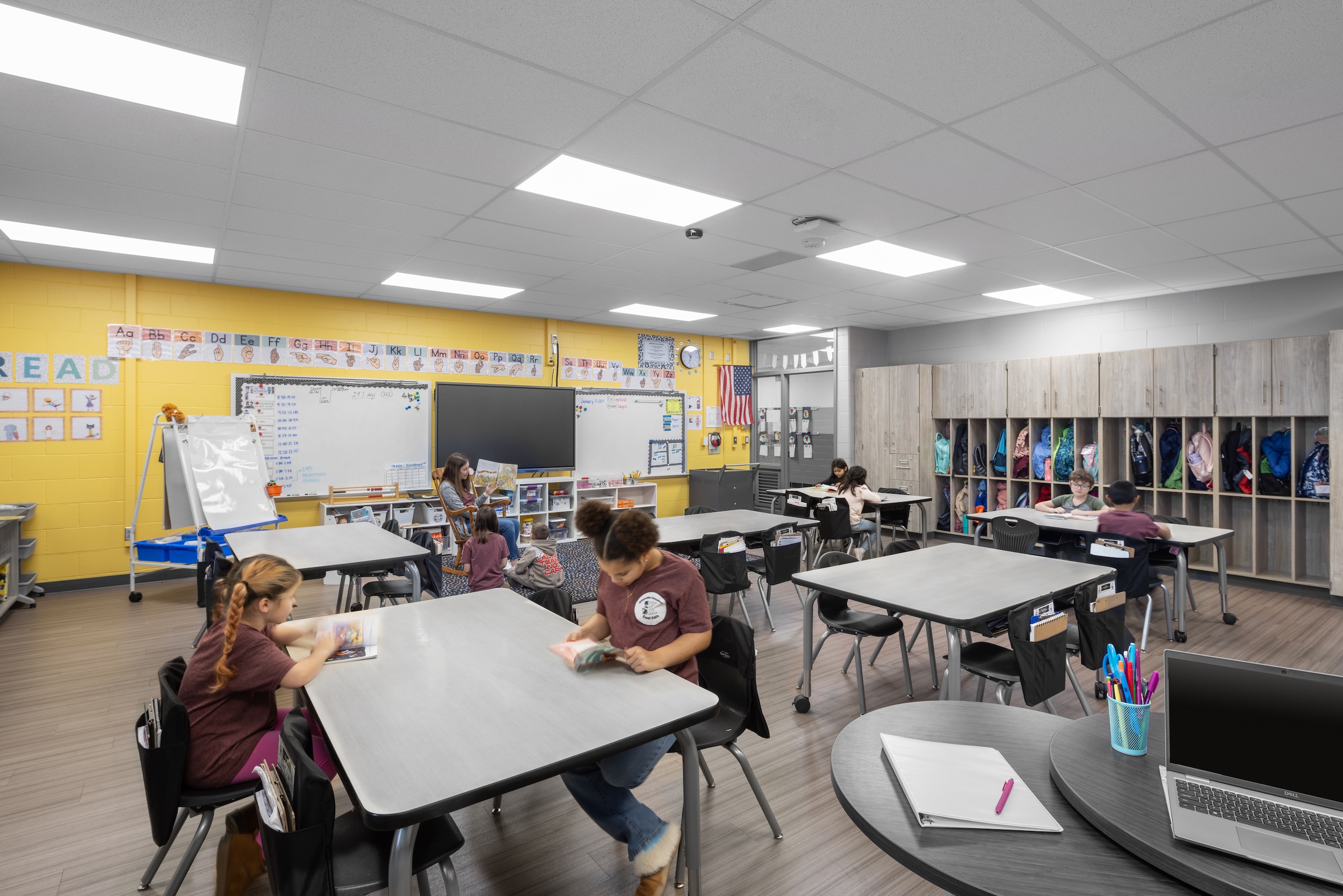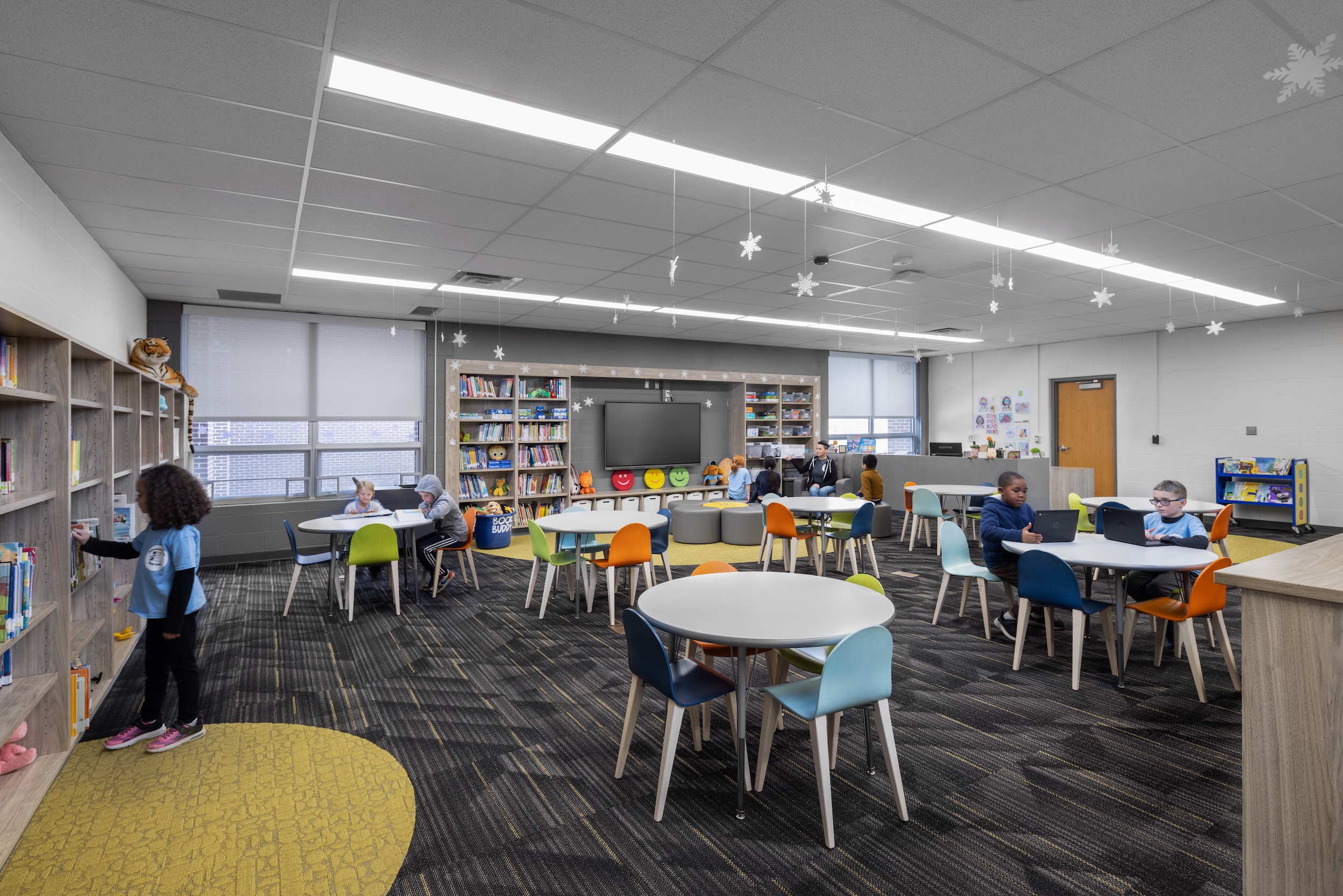 Renovation areas of the 58,000 sq. ft. facility include the classrooms, library, cafeteria, art room, and gymnasium. The building had been renovated through the years, except the gym, which hadn’t been updated in over 100 years. New furniture and finishes enhance learning environments for the district’s youngest students. Additional improvements include HVAC systems and replacement of the flooring and windows, ensuring better air quality and climate control.